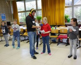 Um 19 Uhr gingen wir live auf Sendung! Die drei Kinder mussten sich nun in ihre Klasse zurückziehen und waren verständlicherweise ziemlich aufgeregt. Nacheinander wurden ihnen nun 4 Fragen gestellt, von denen sie 3 richtig beantworten mussten, um das Paket mit Büchern und Hörbüchern für die Schule zu gewinnen. Die 'Experten' in der Aula wurden 'nur' zum Jubeln gebraucht, die Kinder konnten alle 4 Fragen souverän nach gegenseitiger Beratung beantworten. Respekt!!!