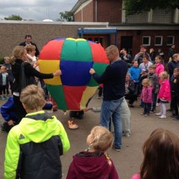 Während der Projektwoche hatten Eltern mit Kindern 2 große Heißluftballons zusammengeklebt - und die durften jetzt gen Himmel schweben. Gottseidank machten Regen und Wind zwischendurch eine Pause, so dass dem Flug nichts im Wege stand.