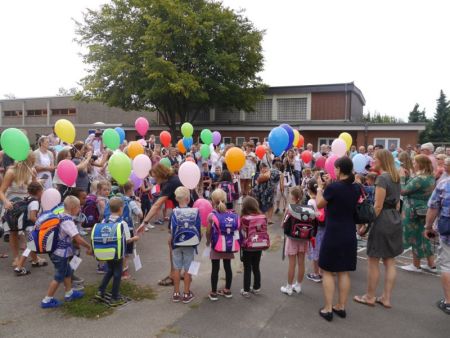 Nun ist es endlich soweit: 40 erwartungsvolle Erstklässler sind an der Jakobus-Schule angekommen! Gestartet wurde mit einem stimmungsvollen ökumenischen Gottesdienst in der katholischen Kirche und auf dem Schulhof wurden die 'Kleinen' dann schon sehnlichst von den 'Großen' erwartet. Jede Klasse hatte sich etwas zur Begrüßung überlegt und unsere Schulhymne zum Schluss wurde mit großer Begeisterung geschmettert. Nach der ersten Unterrichtsstunde mit der Klassenlehrerin ließen wir noch die traditionellen Luftballons steigen und warten gespannt, ob die eine oder andere Karte zurückkommt.