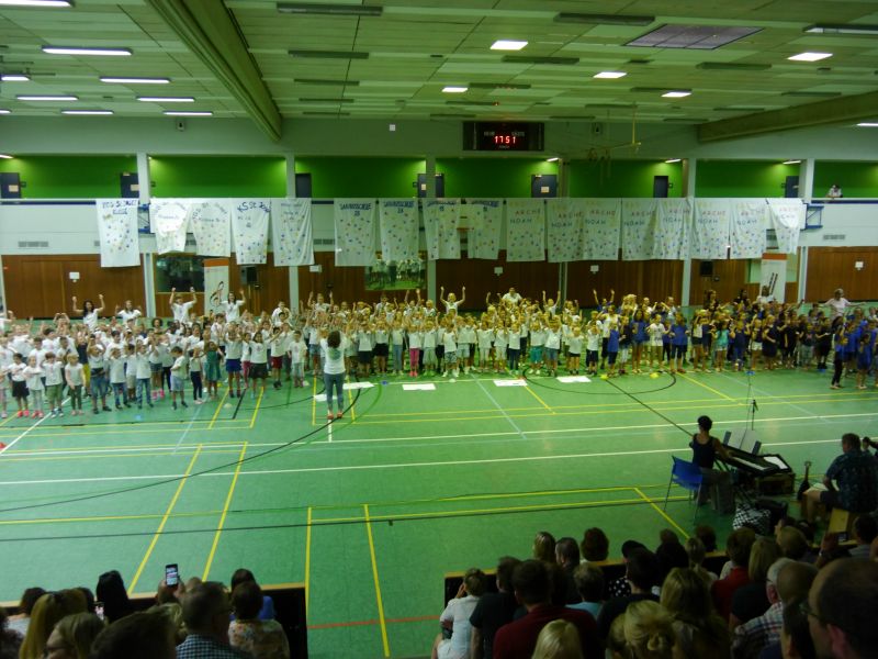 Der Höhepunkt des SingPausen-Jahres ist wieder erreicht: Das große Konzert findet wieder in der Großsporthalle in Gustorf statt. Die 7 teilnehmenden Grevenbroicher Schulen verteilen sich auf zwei Konzerte, in jedem Konzert singen an die 300 Kinder mit. Begleitet werden sie von einer Band aus Musikschullehrern.