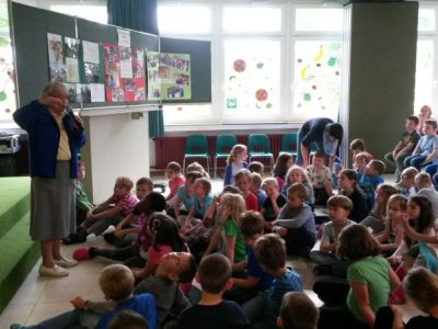 Wie immer durfte die Musik aber auch nicht zu kurz kommen. Zunächst sang unser Jakobus-Schul-Kinder-Chor mit vollem Klang aus 140 Kehlen, dann durften in der Aula die Singpausen-Kinder (1. und 2. Schuljahr) ihre Bewegungslieder vorstellen. Die Musikklasse aus dem 1. Schuljahr präsentierte ein Lied mit Begleitung und auch die Großen spielten mit der Querflöte und den Gitarren vor einem großen Publikum vor.